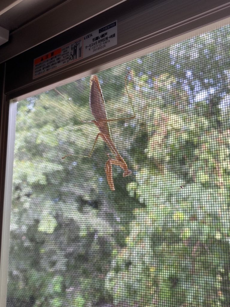 (寝ているベッドの横で、カマキリが網戸に逆さにへばりついて、お祈りをしてくれていました。逆さにお祈りをしてくれているあたり、私と同じ匂いがしました。)