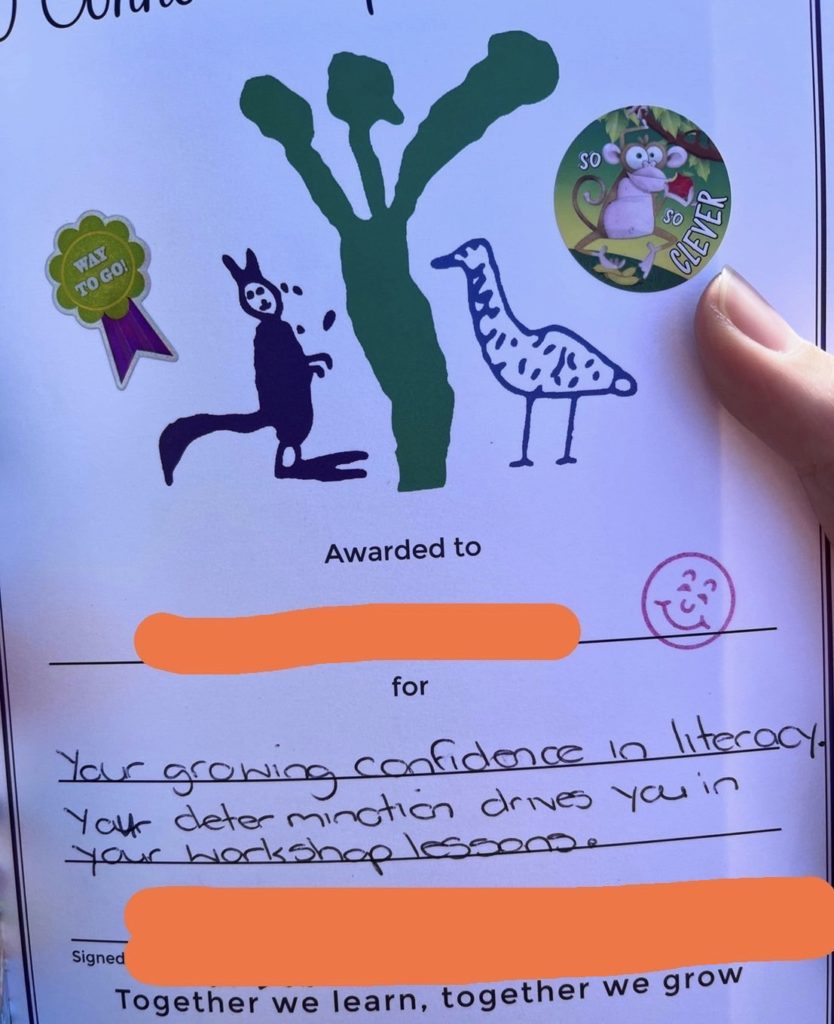 “Awarded to (Kenta) for your growing confidence in literacy.”