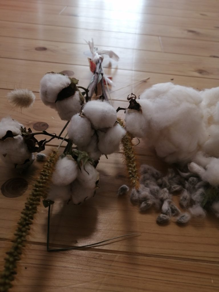 しばらくして「綿の種集めをしなきゃ。」とスタッフに伝えました。さっそく綿の実を持ってきて、種を集めました。「これじゃあ足りないな。」と言う女の子。おやつに柿を出してみると、「種があるよ!集めたら何個あるかな?」とお皿を持ってきて、柿の種を集め始めました。自分で数えて9個の種が集まると、「種を植えないといけないね。」と外へ・・・。畑に向かって歩いて行くと、他のスタッフが枯れ草を燃やしていました。一生懸命種を植えた後、たき火をしていたスタッフのところに行くと、「何か生活にいる物ない?」と尋ねました。スタッフは、驚きながら「う~ん、、、水、かな?」と答えると「はい!わかった!」