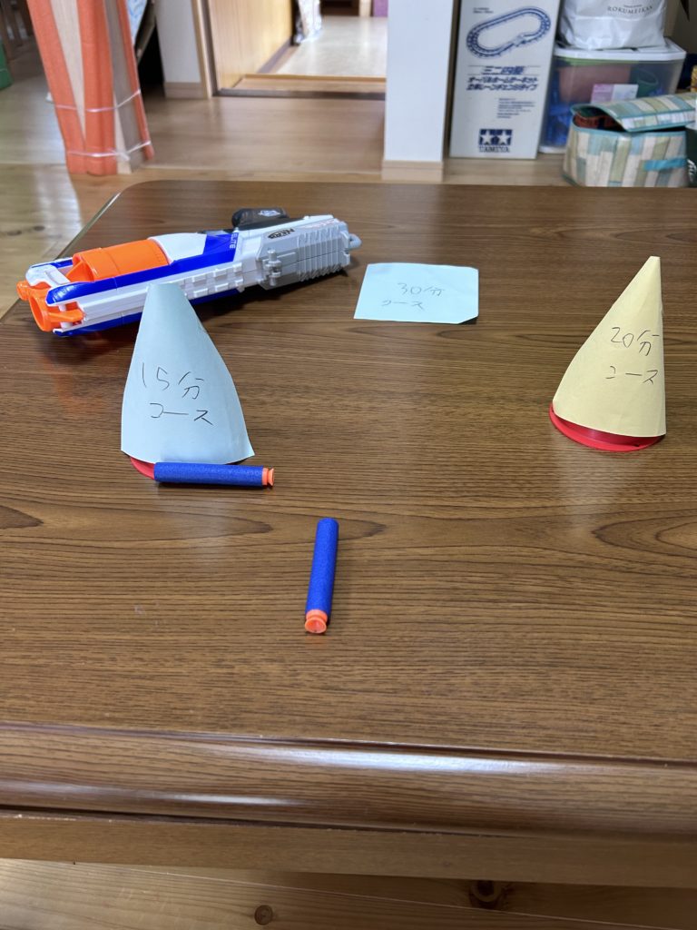 定着してきたなと思っていたある日、タイムタイマーが行方不明になったのです!!「せっかく定着してきたところだったのにー( ノД`)」と思っていると、ナーフで遊んでいた彼女は思いついたようにメモ帳を取り出してきて「15分コース」「20分コース」「30分コース」と書いたのです!それを小さなカラーコーンに巻き付け的あてを始めました。30分コースだけは机の上にぺったりと置かれ、当たらないようにしてありました(笑)「15分コース」をよーく狙って見事に当てると、次は「5時45分コース」「5時30分コース」と書いて、宿題を始める時間もまた的あてで決定しました。こうして宿題に取り掛かるまでの時間も宿題のことを考え続けていました。遊びながら納得することができると、気持ちは切り替えられるものです。そしていつも思うのは、やらなきゃいけない面倒な宿題は、それでもその子にとって大事な生活の一部となっているということです。